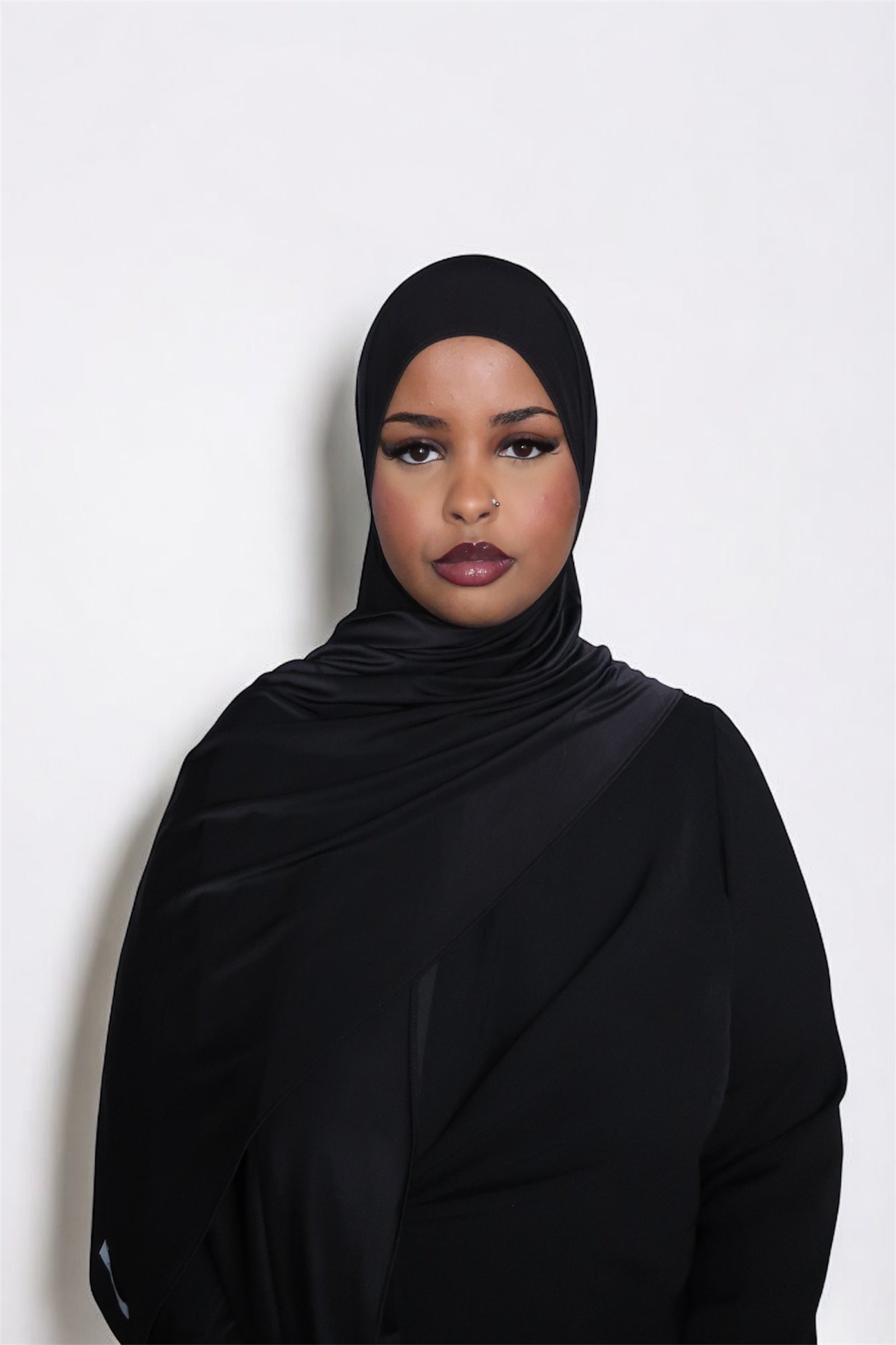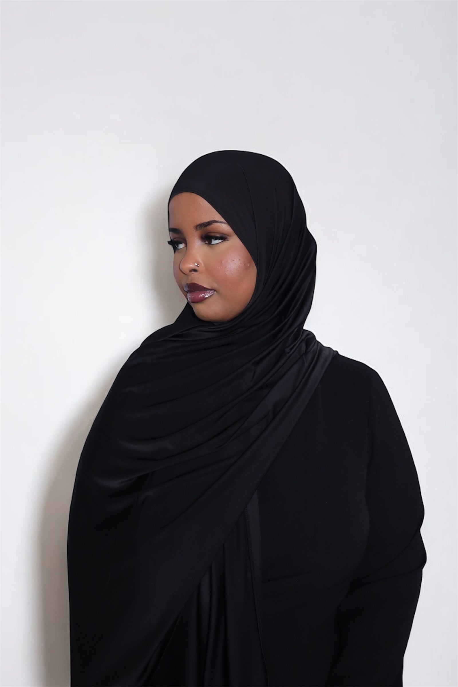 Our Liquid Jersey scarves are made from a soft and supple blend of polyester and spandex, which provides a comfortable stretch and a beautiful, natural drape. They are lightweight yet opaque and not see-through. The material is easy to shape and stays comfortably in place all day.