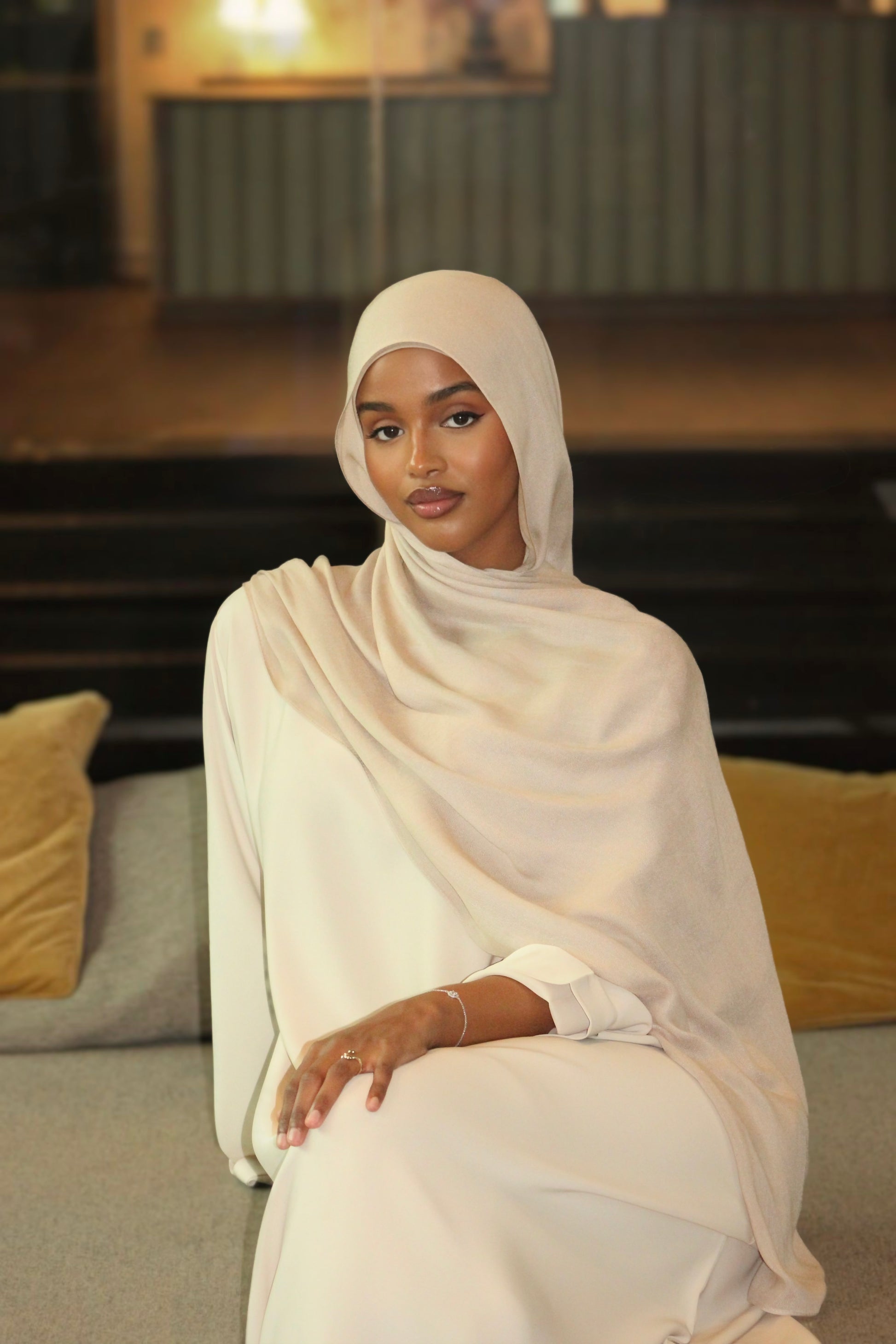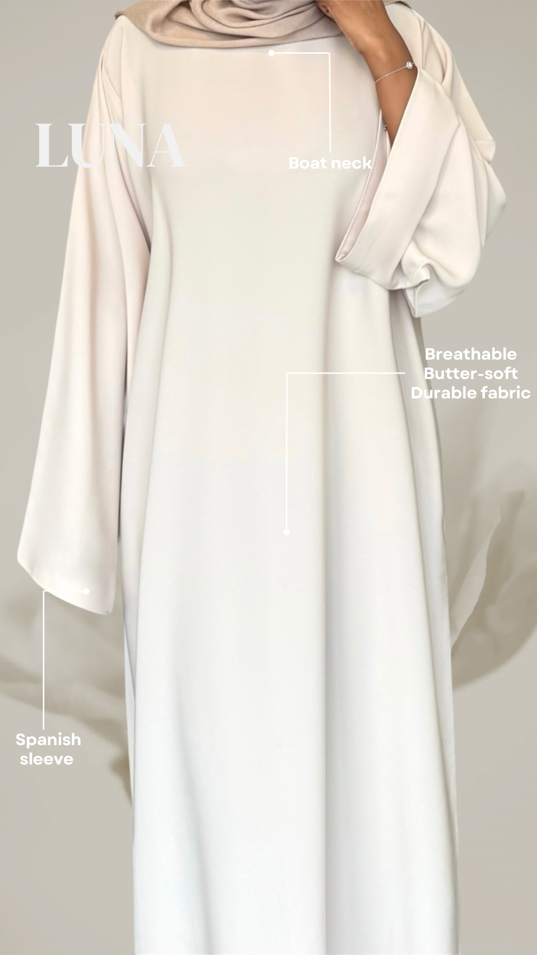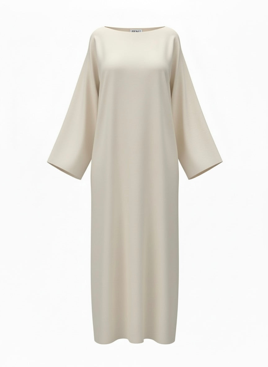 LUNA - en elegant abaya i en mjuk cremefärgad nyans som kombinerar enkelhet med sofistikerad stil. Med vida och mjukt fallande ärmar skapas en graciös silhuett dessutom har LUNA en boat neck som ramar in halsen på ett stilfullt sätt.