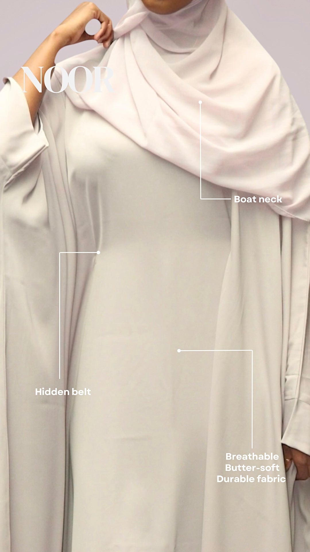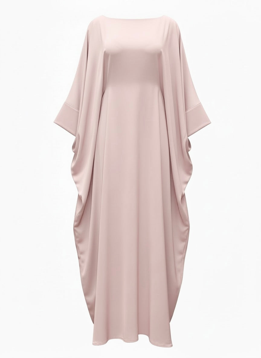 NOOR - en tidlös abaya i en mjuk ljusrosa ton som utstrålar elegans och enkel stil. Den är i butterfly-modell, med vida, mjukt fallande ärmar som skapar en elegant silhuett. NOOR har en boat neck som ger en sofistikerad halsringning samt ett diskret band på insidan som gör det möjligt att forma efter önskemål för en personlig passform.