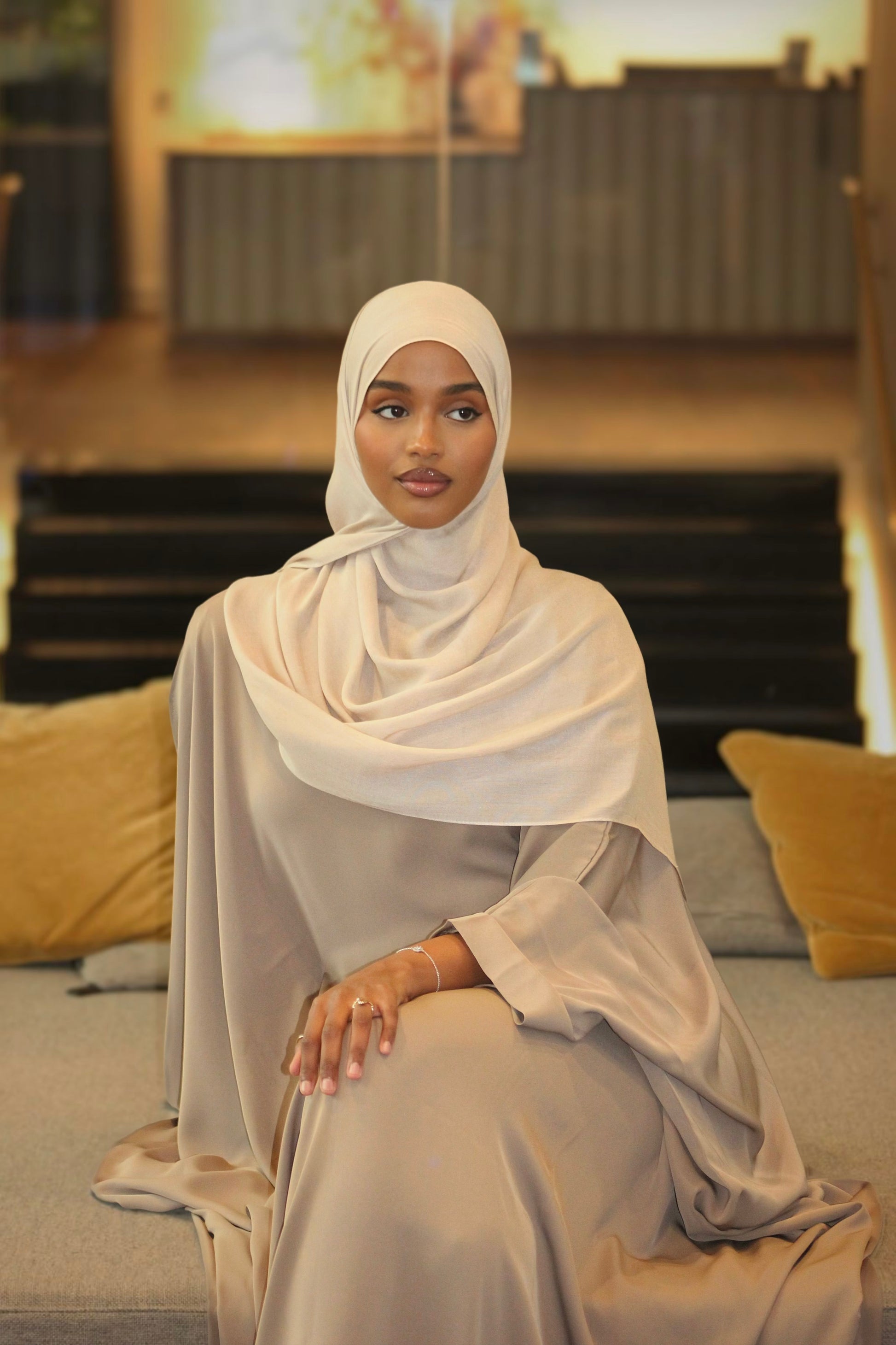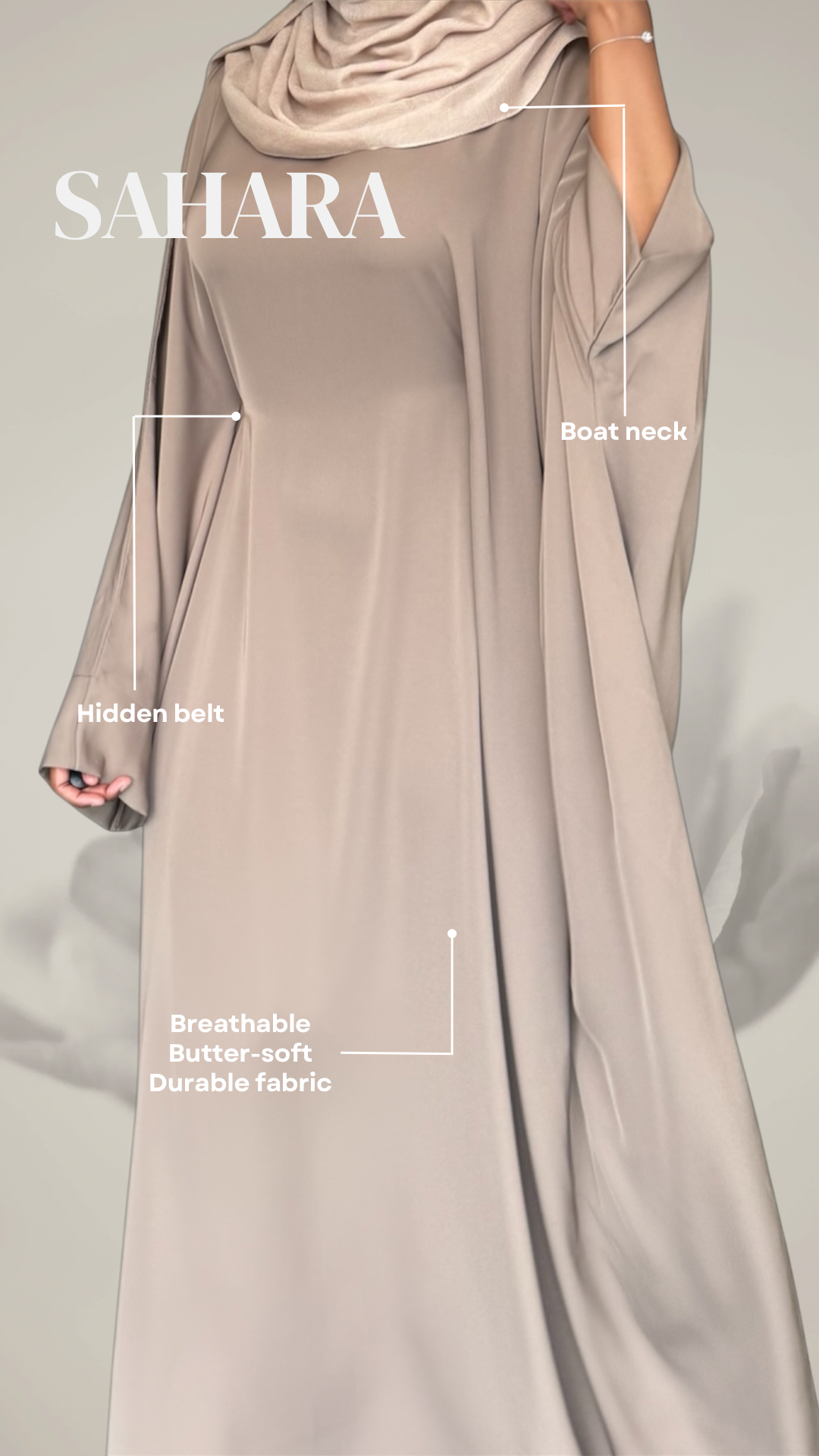 SAHARA - en tidlös abaya i en mjuk sandbeige ton som utstrålar elegans och enkel stil. Den är i butterfly-modell, med vida, mjukt fallande ärmar som skapar en elegant silhuett. SHARA har en boat neck som ger en sofistikerad halsringning samt ett diskret band på insidan som gör det möjligt att forma efter önskemål för en personlig passform.